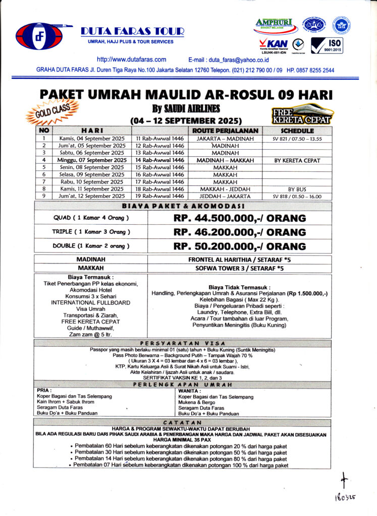 Categories PAKET UMROHPAKET UMRAH MAULID AR RASUL 09 HARI 04 – 12 SEPTEMBER 2025 GOLD CLASS Post author By admindutafaras Post date July 10, 2024 No Comments on PAKET UMRAH MAULID AR RASUL 09 HARI 04 – 12 SEPTEMBER 2025 GOLD CLASS BerandaTentang KamiJadwalGaleriDokumentasi PerjalananFasilitasHubungi kami X Detail Paket Tertarik dengan paket tersebut? DAFTAR SEKARANG Graha Duta FarasJl. Duren Tiga Raya No. 100Jakarta Selatan 12760Telpon : 021 212 790 / 09E-mail : duta_faras@yahoo.co.idDetail Lokasi Lihat kami di media sosial Instagram Facebook Youtube Hubungi kami Whatsapp