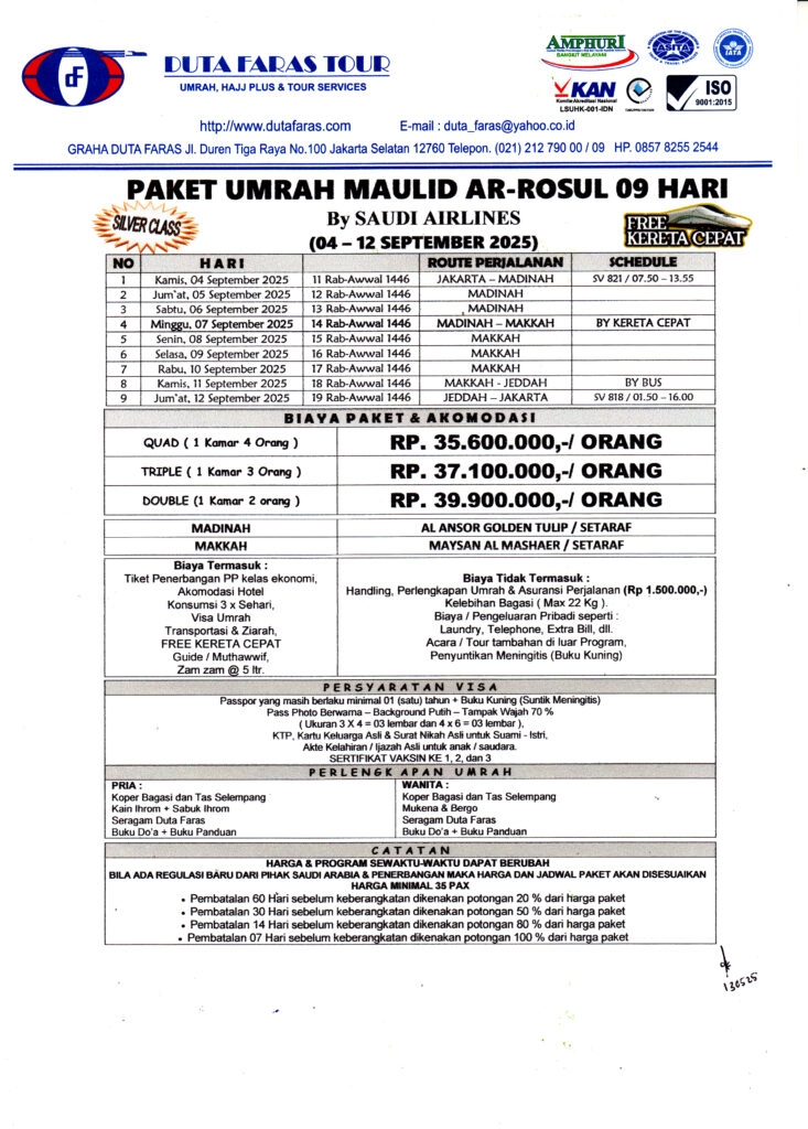 Categories PAKET UMROHPAKET UMRAH MAULID AR RASUL 09 HARI 04 – 12 SEPTEMBER 2025 SILVER CLASS Post author By admindutafaras Post date July 10, 2024 No Comments on PAKET UMRAH MAULID AR RASUL 09 HARI 04 – 12 SEPTEMBER 2025 SILVER CLASS BerandaTentang KamiJadwalGaleriDokumentasi PerjalananFasilitasHubungi kami X Detail Paket Tertarik dengan paket tersebut? DAFTAR SEKARANG Graha Duta FarasJl. Duren Tiga Raya No. 100Jakarta Selatan 12760Telpon : 021 212 790 / 09E-mail : duta_faras@yahoo.co.idDetail Lokasi Lihat kami di media sosial Instagram Facebook Youtube Hubungi kami Whatsapp